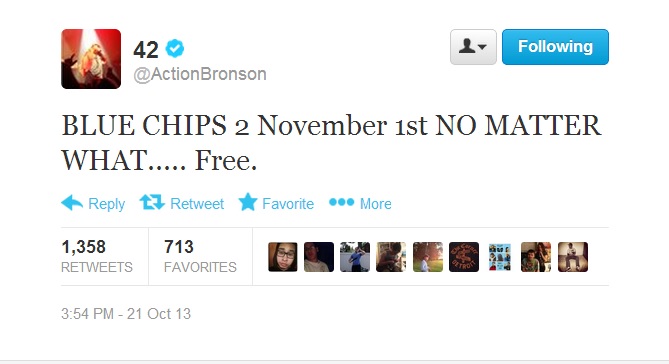 At the top of the month, Action Bronson took to Twitter to deliver the news that his upcoming collaborative mixtape with producer Party Supplies, Blue Chips 2, would be released the first day in November. As a result, most fans were somewhat puzzled at the announcement and at first all they could really do was cross their fingers and patiently wait. However, fans no longer need to wait in anticipation as Bronsolini took to Twitter again today and officially dropped the news that fans can expect the project on November 1